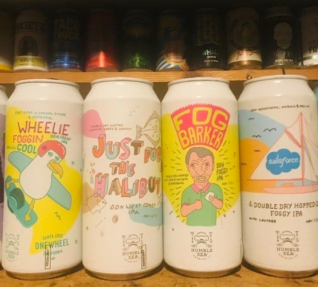 That is a four-pack of Humble Sea Beer that I created at my neighborhood beer bar/shop, Out Of The Barrel, here in Fresno, CA. It cost me $27 before taxes. A four-pack of one of these beers would normally cost $20 at the brewery in Santa Cruz, a couple of hours away. It is not a widely distributed brewery, only select shops have it. It’s very good, all be it hazy (foggy), beer.