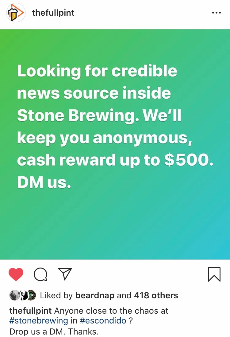 As the drama continues regarding Stone vs. SawStone (Stone’s CEO left the company), a great byproduct happened this week. The Full Pint offered $500 to someone with inside knowledge of what’s going on at Stone…